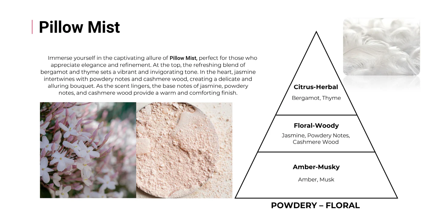 Immerse yourself in the captivating allure of Pillow Mist, perfect for those who appreciate elegance and refinement. At the top, the refreshing blend of bergamot and thyme sets a vibrant and invigorating tone. In the heart, jasmine intertwines with powdery notes and cashmere wood, creating a delicate and alluring bouquet. As the scent lingers, the base notes of jasmine, powdery notes, and cashmere wood provide a warm and comforting finish.